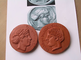 For the Billings Middle School, also in Seattle, I designed and modeled two coin-like medallions of a boy and a girl, for their Greek themed auction. I made plaster molds of the original artwork, then pressed and fired several dozen terra cotta medallions. The advantage of this method is that many people could support the school and leave with unique art for a small price.